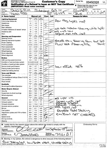 It was preserved in September 2004 by members of Transport Yorkshire Preservation Group, under whom it is under restoration, as and when time and funds permit. On the occasion the vehicle was collected from premises used by the West Yorkshire Youth Association it attended an MOT at Doves Truck & Van (LDV Main Dealer) of North Huddersfield; the MOT failure sheet (which lists the minimum level of work that is required to enable an MOT to be issued) is available here (please note two mistakes - as 591 was constructed and registered in 1974 it doesn't have (nor is it required to have) rear fog lights and neither is a vehicle of that age required to be subjected to a formal emissions test - a visual opinion being sufficient).